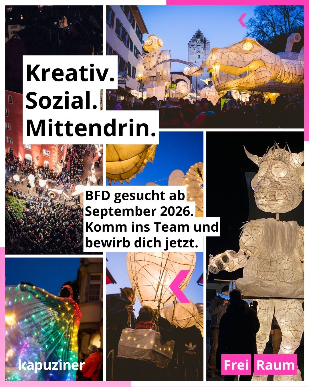2020 fand in Ravensburg das erste Lichterfest statt, das im KAPUZINER Zuhause ist. 2022 das zweite - mit mehr als 18.000 Besucher*innen und hunderten Leuchtfiguren und 2025 mit ca. 45.000 Besuchenden. Künstler und Gestalter haben in der Innenstadt Lichtinstallationen und beleuchtete Großskulpturen präsentiert. Die Werkstatt hat schon wieder geöffnet und wir freuen uns auf die vierte Auflage am 07.März 2026!