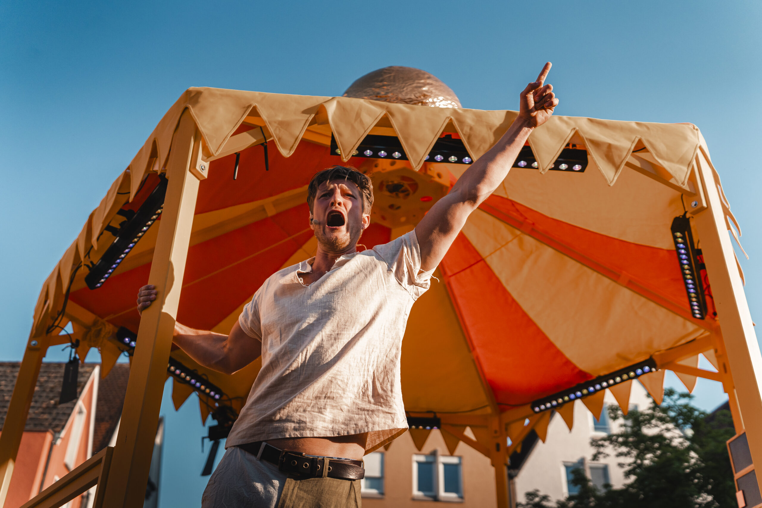 Im Mittelpunkt steht das Musiktheaterstück, das die Ereignisse des Bauernkriegs packend in Szene setzt. Der Narr führt als Zeremonienmeister durch die Handlung und verbindet dabei Ernsthaftigkeit mit einem reflektierenden Blick. Mit eindrucksvollen Liedern und vielstimmigen Szenen eröffnet das Stück eine emotionale Zeitreise: von Hoffnung und Widerstand bis hin zu den tragischen Konsequenzen der Erhebung. Die Musik bildet dabei das Herzstück – elf eigens komponierte Stücke, die historische Themen mit aktuellen Fragen verknüpfen und generationsübergreifend wirken.