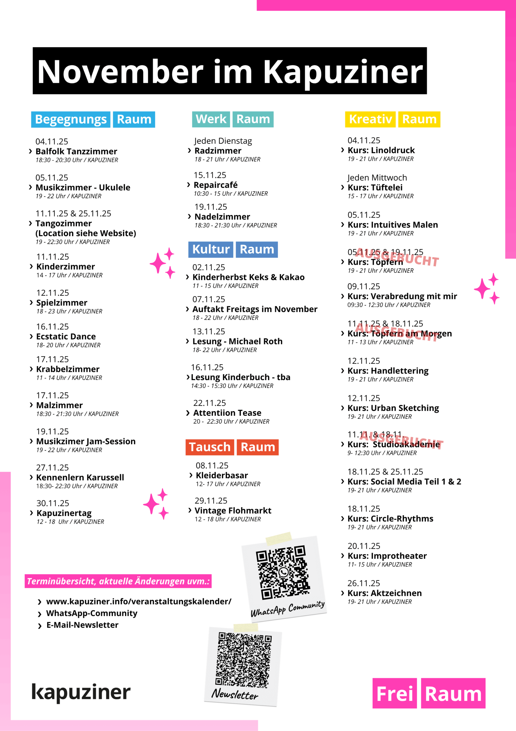 Mach mit beim Lichterfest! Unser Lichterfest ist kein Event, das man einfach nur besucht – es ist ein Fest, das von uns allen gemacht wird. Ein großes Community-Art-Projekt, das Menschen aus der ganzen Region Bodensee – Oberschwaben – Allgäu zusammenbringt. 🌟 Das Herzstück des Projekts ist unsere offene Werkstatt.Hier , ...Offener Leitungskreis – der Vorstand lädt ein zum offenen Austausch18:30Das Leitungsteam vom KAPUZINER lädt zum offenen Austausch ein. Kommt mit euren Themen, hört was auf der Agenda des Vorstands steht oder kommt einfach auf ein Kennenlernen vorbei. Falls ihr Themen habt bitten wir euch diese vorab bei stephanie@kapuziner.info anzumelden , ... - 7Auftakt Freitags im November16:00 - 23:30Fr, 7. November 2025, ab 16 UhrKAPUZINER Ravensburg Zum Start der diesjährigen Reihe freitags im november gestaltet das KAPUZINER den ersten Abend gemeinsam mit regionalen Künstler*innen aus verschiedenen Disziplinen. Unter dem Motto „Liebe“ erwartet Euch ein vielseitiges Programm mit Musik, Bildern, Poesie und besonde , ...Lichterfest: offene Werkstatt16:30 - 20:00